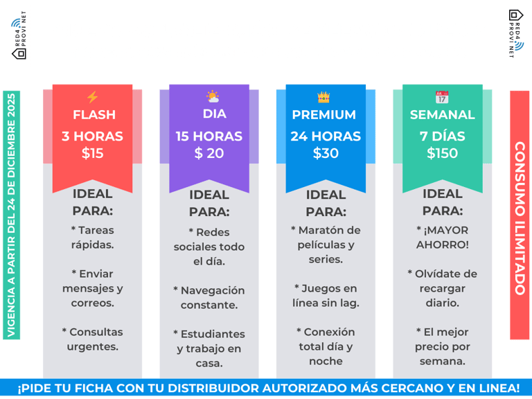 Al igual que nuestros planes mensuales, las fichas te dan acceso total a nuestra infraestructura con consumo de datos ilimitado durante el tiempo elegido.